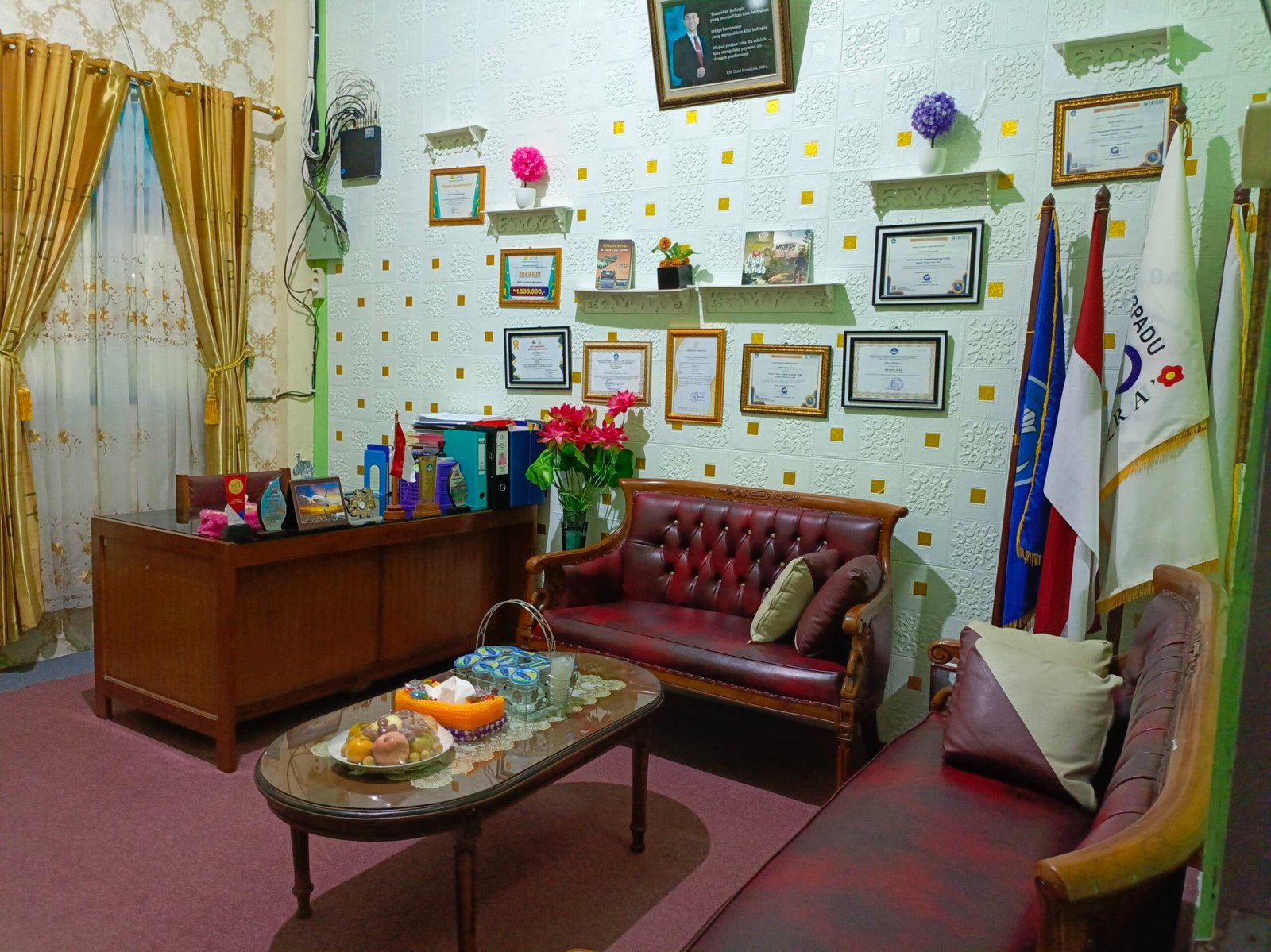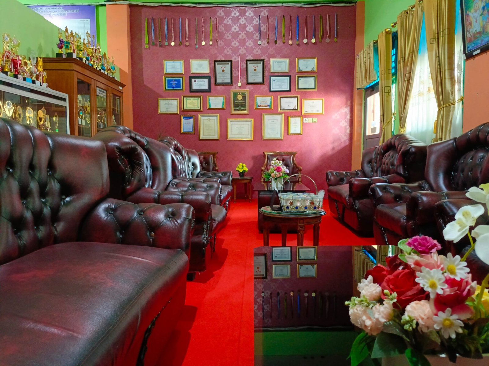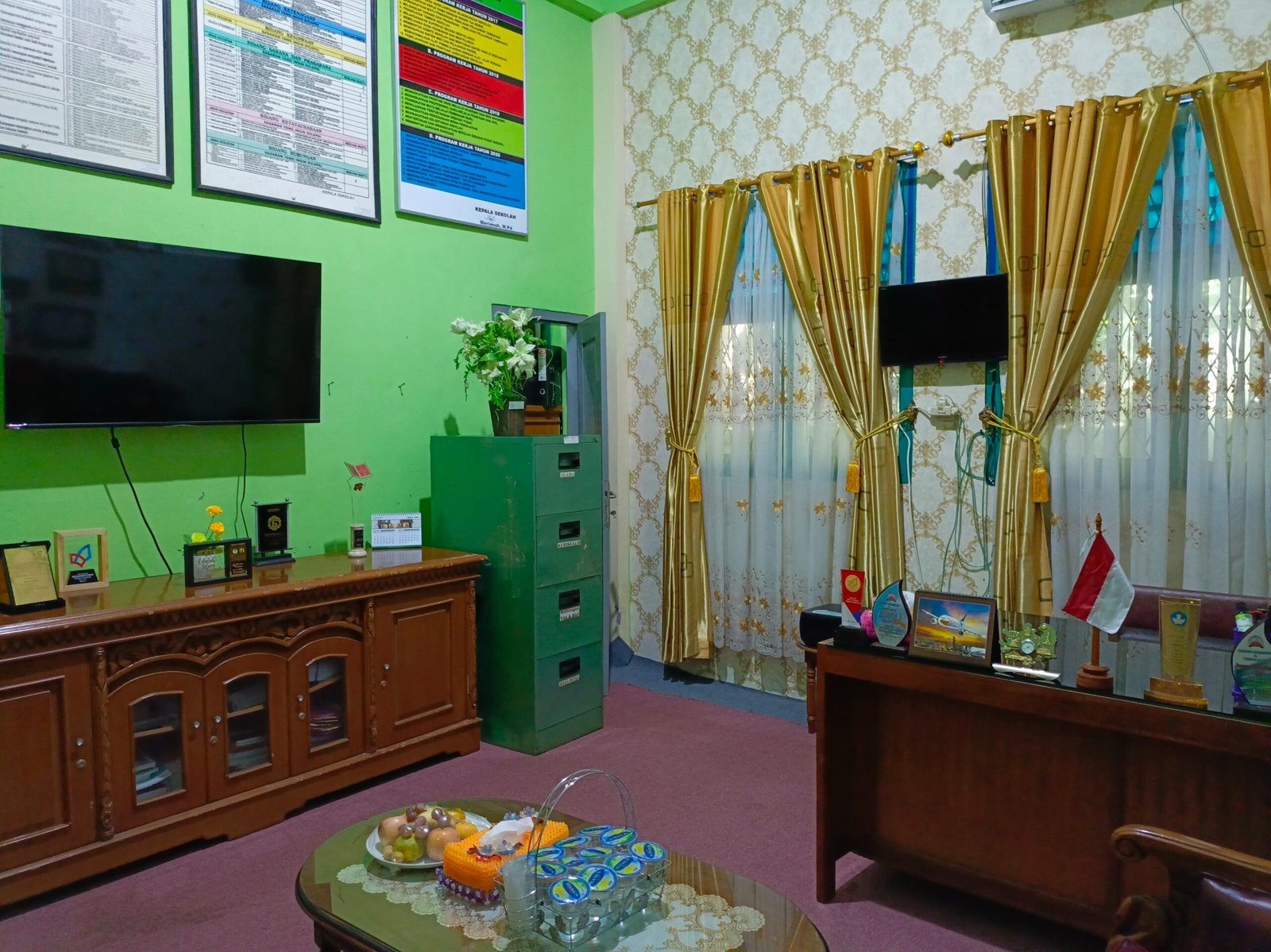 Dinding ruang kepala sekolah dihiasi dengan berbagai penghargaan dan sertifikat, mencerminkan dedikasi sekolah dalam menjaga mutu pendidikan. Pencahayaan yang cukup dan sirkulasi udara yang baik menciptakan suasana kerja yang kondusif bagi kepala sekolah dalam menjalankan tugasnya.